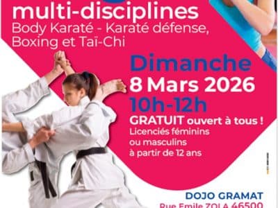 Le 08 mars 2026 le Comité départemental de Karaté et Disciplines associées organise, à Gramat, un stage multi-disciplines, Body Karaté – Karaté défense, Boxing et Taï-Chi GRATUIT ouvert à tous ! Licenciés féminins ou masculins à partir de 12 ans.