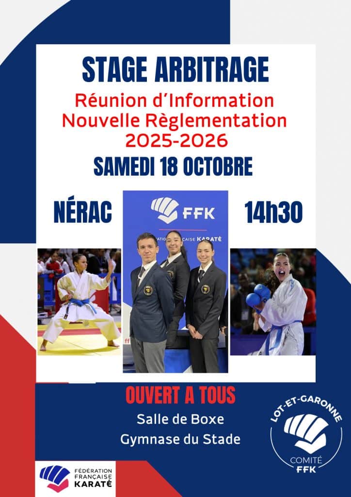 STAGE ARBITRAGE Date Sam. 18 Octobre 2025 à 14h30 Lieu NERACSALLE DE BOXE 47600 NERAC Réunion d’Information nouvelle Règlementation 2025-2026 14H30 – salle de boxe située au gymnase du stade – 47600 Nérac. Réunion ouverte à tous.