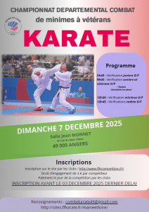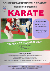 Nous vous informons de l’organisation de la COUPE KUMITE Pupilles et benjamins ainsi que du CHAMPIONNAT KUMITE adultes de minimes à vétérans qui auront lieu à Angers le dimanche 7 décembre 2025.