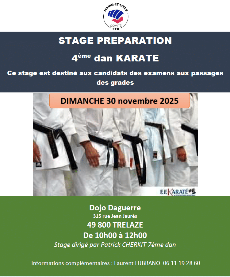 Nous vous informons d’un stage de préparation au grade de 4ème dan karaté qui se tiendra le dimanche 30 novembre de 10h00 à 12h00. Ce stage sera encadré par Patrick CHERKIT 7ème dan.