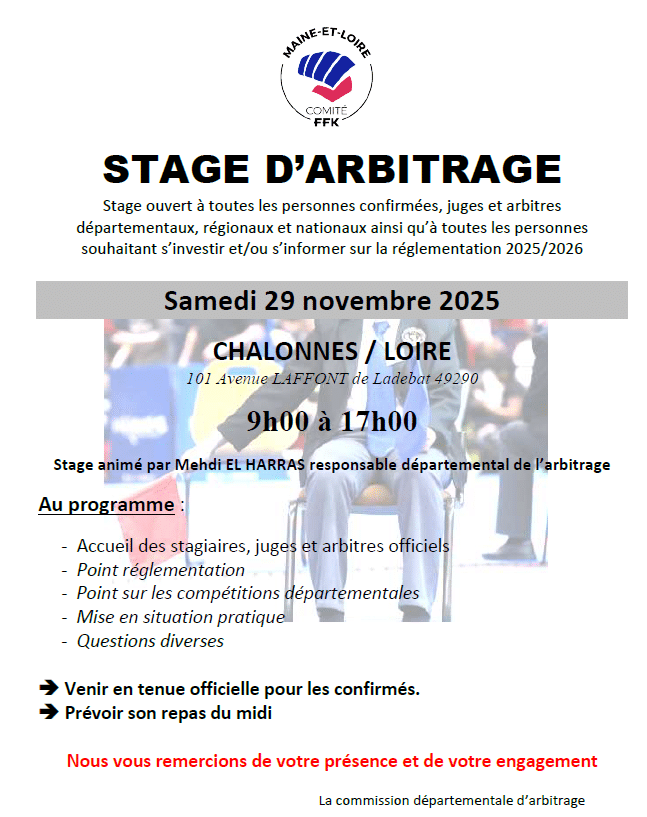 La commission d’arbitrage organise le samedi 29 novembre 2025 un stage d’arbitrage destiné aux officiels ainsi qu’aux personnes souhaitant intégrer la commission. Ce stage sera dirigé par les responsables de la commission et se tiendra à Chalonnes sur Loire.