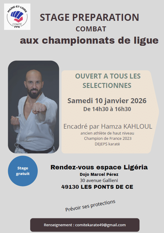 Suite à la coupe et au championnat départemental kumité, le comité organise un stage de préparation qui aura lieu aux PONTS DE CE la samedi 11 janvier. Ce stage sera dirigé par Hamza KAHLOUL ancien athlète de haut niveau.