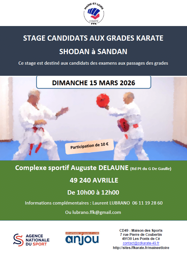 Le comité départemental organise un stage de préparation aux grades karaté du premier au troisième dan. Ce stage aura lieu à Avrillé le dimanche 15 mars de 10h00 à 12h00.
