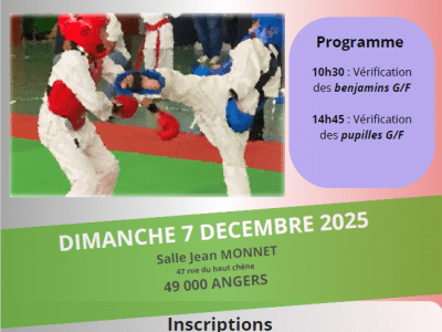 Nous vous informons de l'organisation de la COUPE KUMITE Pupilles et benjamins ainsi que du CHAMPIONNAT KUMITE adultes de minimes à vétérans qui auront lieu à Angers le dimanche 7 décembre 2025. La date limite des inscriptions est fixée au 3 décembre dernier délai. Affiche Kumité adultes 7.12.2025 Affiche coupe kumité 7.12.2025
