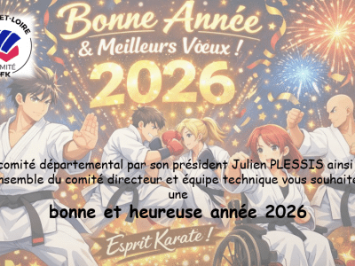 Le comité départemental de karaté et disciplines associées par la voie de son président Julien PLESSIS vous souhaite au nom de l'ensemble du comité directeur et de l'équipe technique une très bonne année 2026, que celle-ci vous apporte la santé, la joie et le bonheur ainsi que des réussites dans tous vos projets professionnels, sportifs [...]