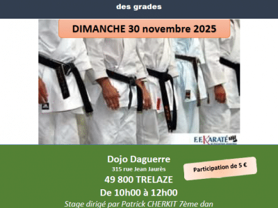 Nous vous informons d'un stage de préparation au grade de 4ème dan karaté qui se tiendra le dimanche 30 novembre de 10h00 à 12h00. Ce stage sera encadré par Patrick CHERKIT 7ème dan. Bonne préparation Stage préparation grade 4eme dan karate 30.11.25