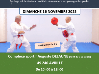 Madame, Monsieur, nous vous informons que le premier stage de préparation aux grades karaté se tiendra le DIMANCHE 16 NOVEMBRE 2025 à Avrillé. Ce stage sera encadré par la commission des grades et son responsable Laurent LUBRANO. Ce stage concerne les futurs candidats aux grades de 1er, 2ème et 3ème dan karaté. Stage PREPARATION GRADES [...]