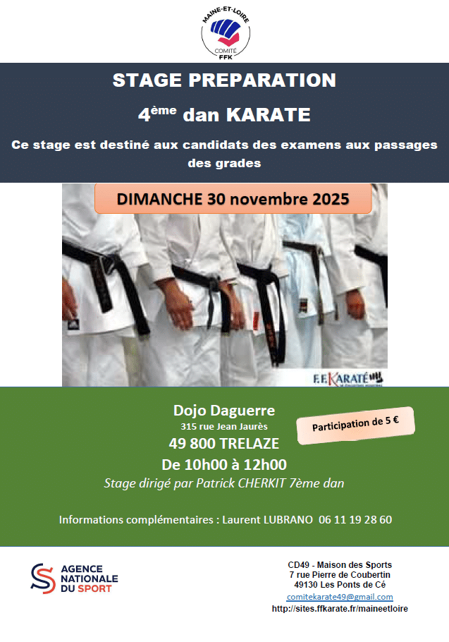 Nous vous informons d'un stage de préparation au grade de 4ème dan karaté qui se tiendra le dimanche 30 novembre de 10h00 à 12h00. Ce stage sera encadré par Patrick CHERKIT 7ème dan. Bonne préparation Stage préparation grade 4eme dan karate 30.11.25