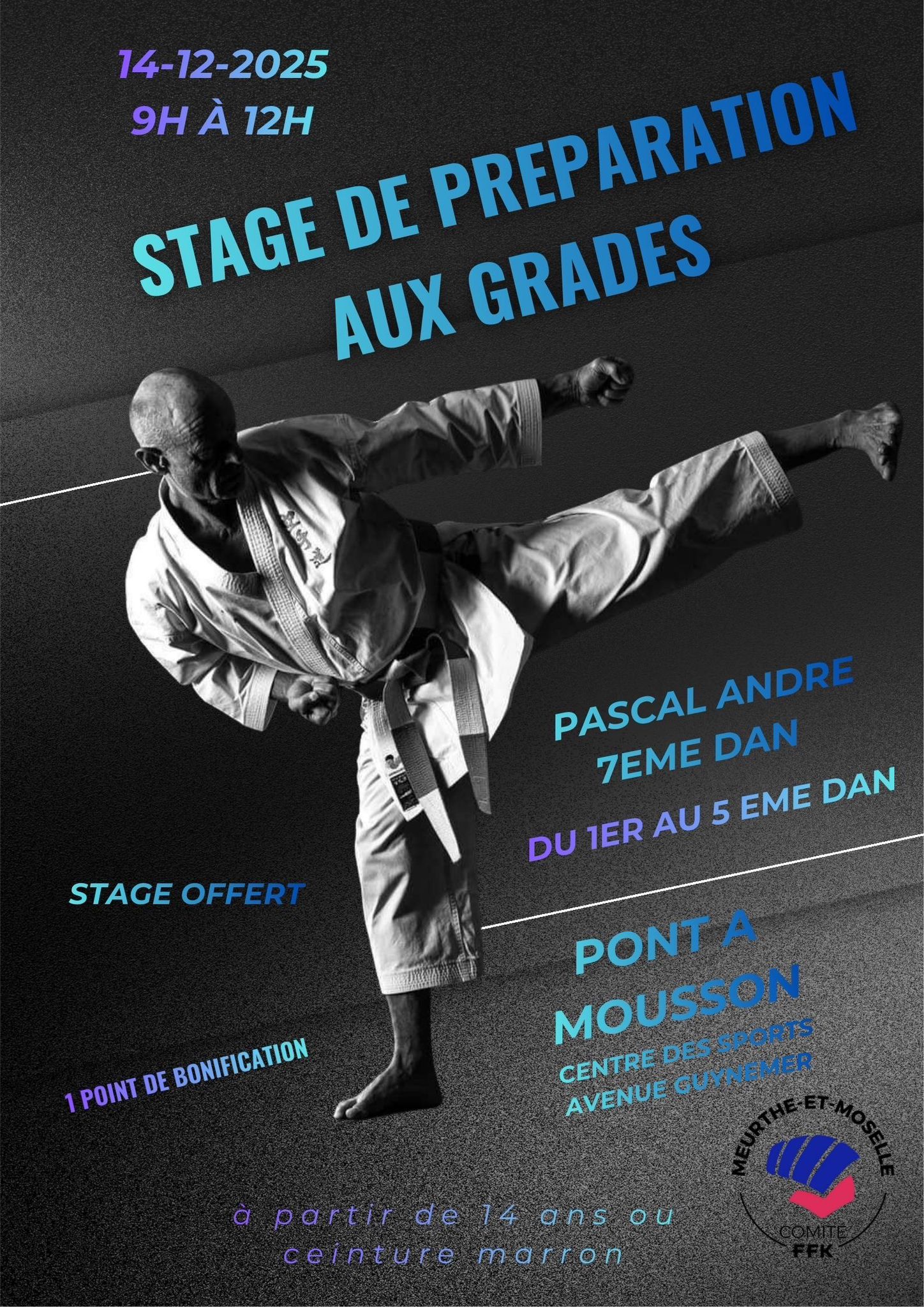 STAGE DE PREPARATION AUX GRADES OFFERT ET ANIME PAR PASCAL ANDRE Date Dim. 14 Décembre 2025 de 09h à 12h Lieu Centre des sports - PONT A MOUSSON