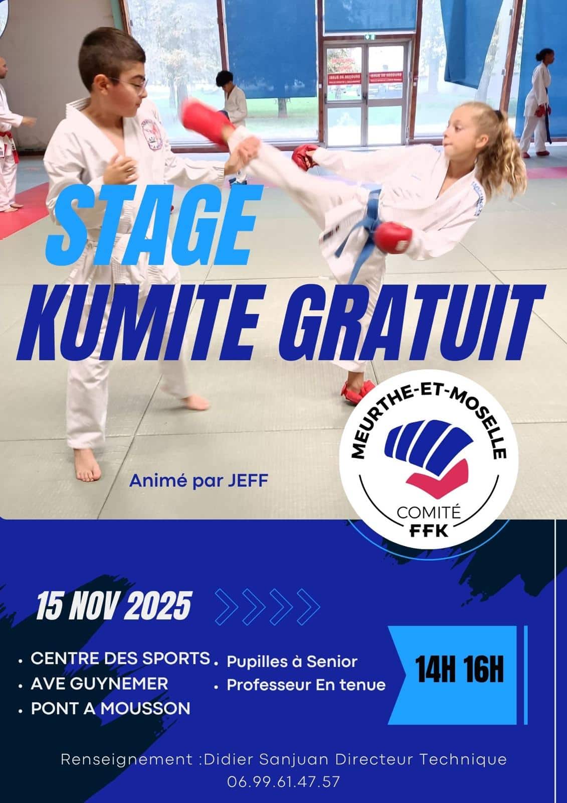 Stage karaté kumité gratuit animé par Jean François Tiercy Date Sam. 15 Novembre 2025 de 14h à 16h Lieu Centre des sports - PONT A MOUSSON