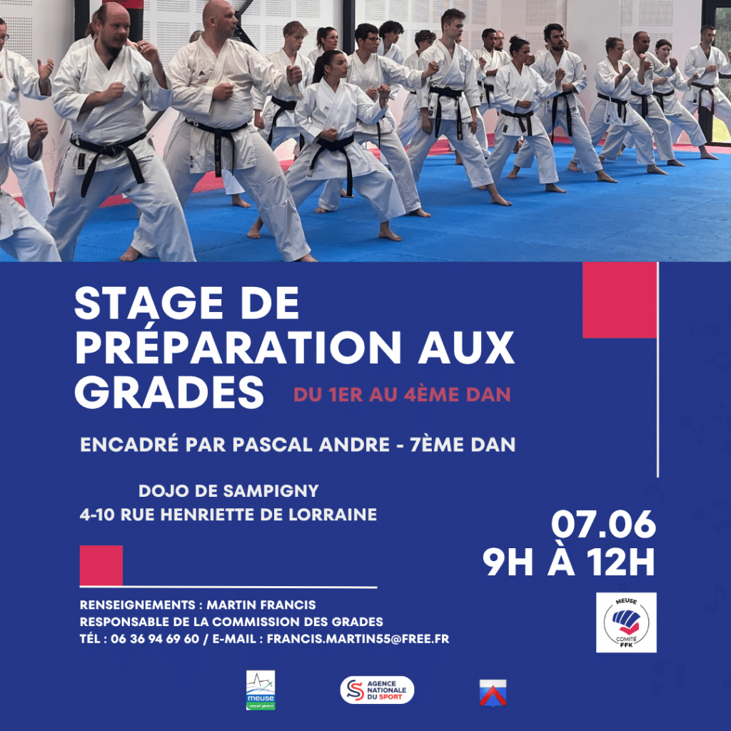 Le comité de Meuse organise un stage pratique de préparation aux grades animé par Pascal ANDRÉ, 7e DAN. Ce stage est ouvert à partir de 14 ans et permet d’obtenir un point de bonification pour les passages de grade.
