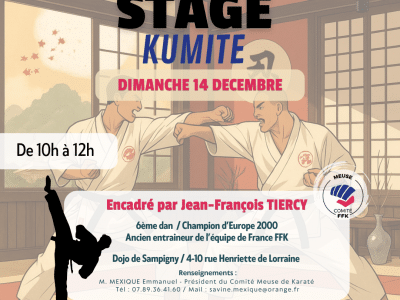 Le Comité Meuse de Karaté organise un stage exceptionnel de Kumité, encadré par Jean-François Tiercy, 6ème dan, Champion d’Europe 2000 et ancien entraîneur de l’équipe de France FFK. 📅 Date : Samedi 19 octobre 2024🕙 Horaire : 10h – 12h📍 Lieu : Dojo de Sampigny – 4-10 rue Henriette de Lorraine Ce stage s’adresse à [...]