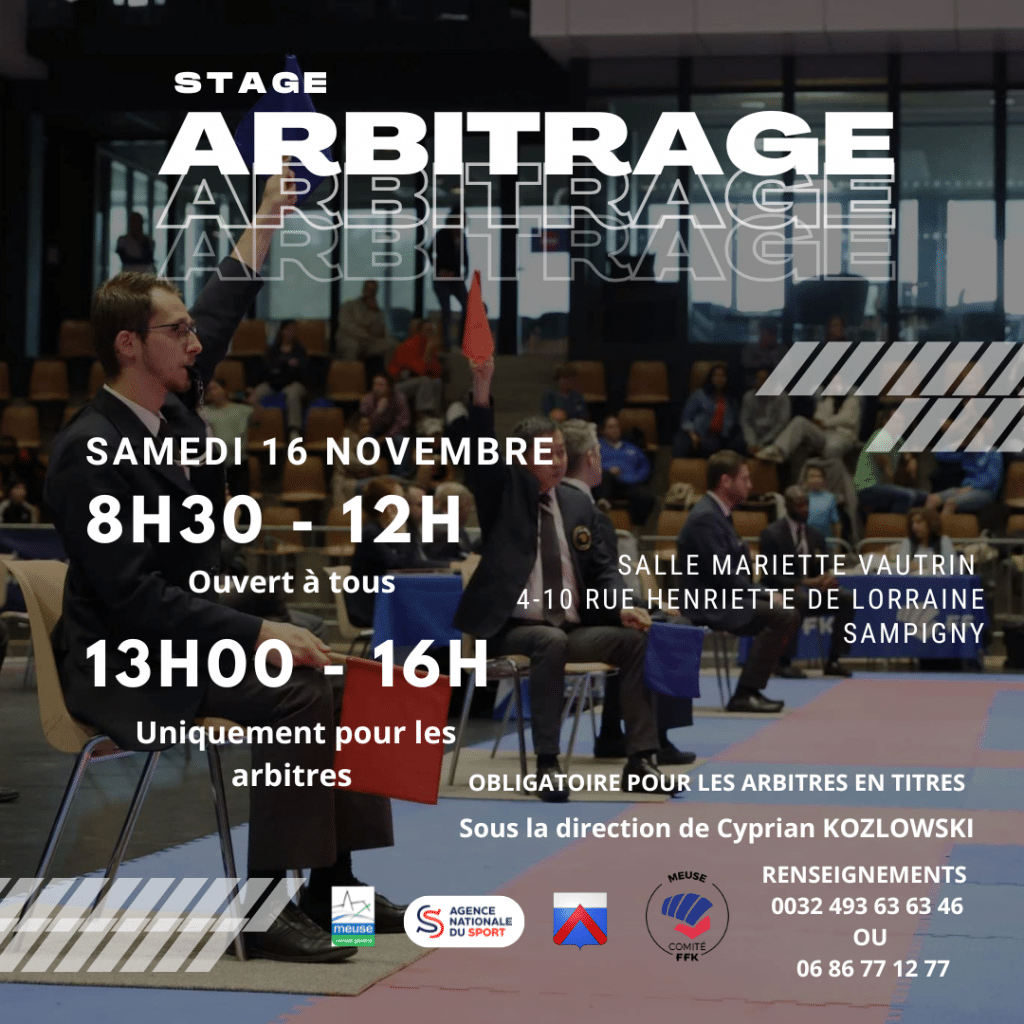 Sous la direction de Cyprian KOZLOWSKI, le Comité Départemental de Karaté de la Meuse organise un Stage d’Arbitrage. Date : Dimanche 16 novembre 2025Lieu : Salle Mariette Vautrin – 4-10 rue Henriette de Lorraine, 55300 Sampigny Horaires : De 8h30 à 12h00 : Présentation du règlement des compétitionsOuvert à tous : arbitres, compétiteurs, coaches, entraîneurs, [...]