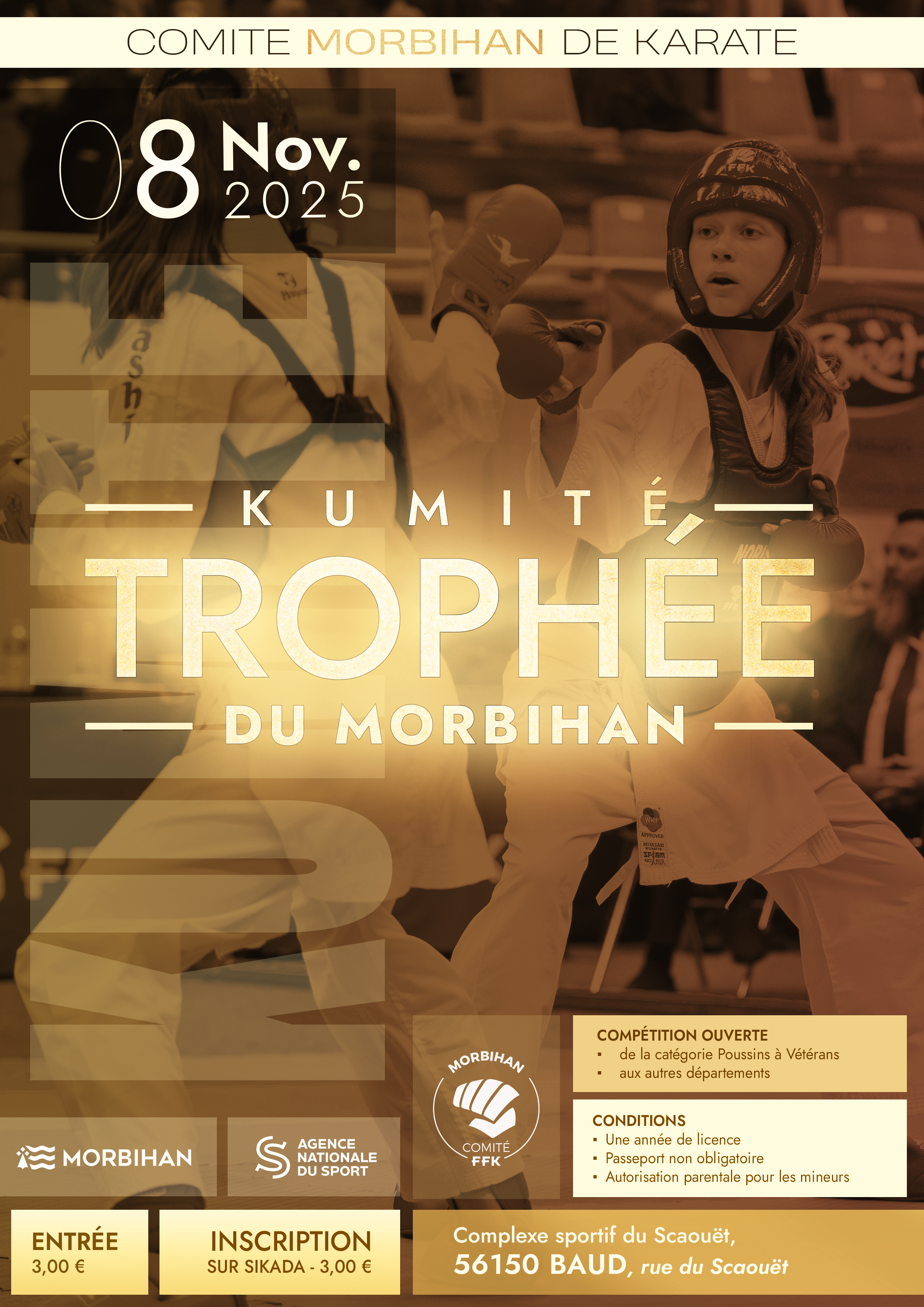 TROPHEE DU MORBIHAN KUMITE P/P/B/M/C/J/S/V1 Date Sam. 8 Novembre 2025 Lieu BAUD à confirmerSALLE DES SPORTS 56150 BAUD