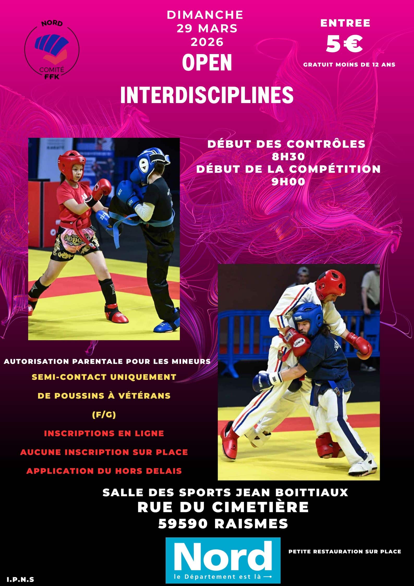 OPEN Départemental du Nord Inter disciplines PPBMCJS et Vétérans (M/F) LIGHT. Date Dim. 29 Mars 2026 Lieu RaismesSalle des Sports JEAN BOITTIAUX Rue du Cimetière 59590 RAISMES Attention au délais pour les inscriptions, mise en application des frais. Pas de plein contact.