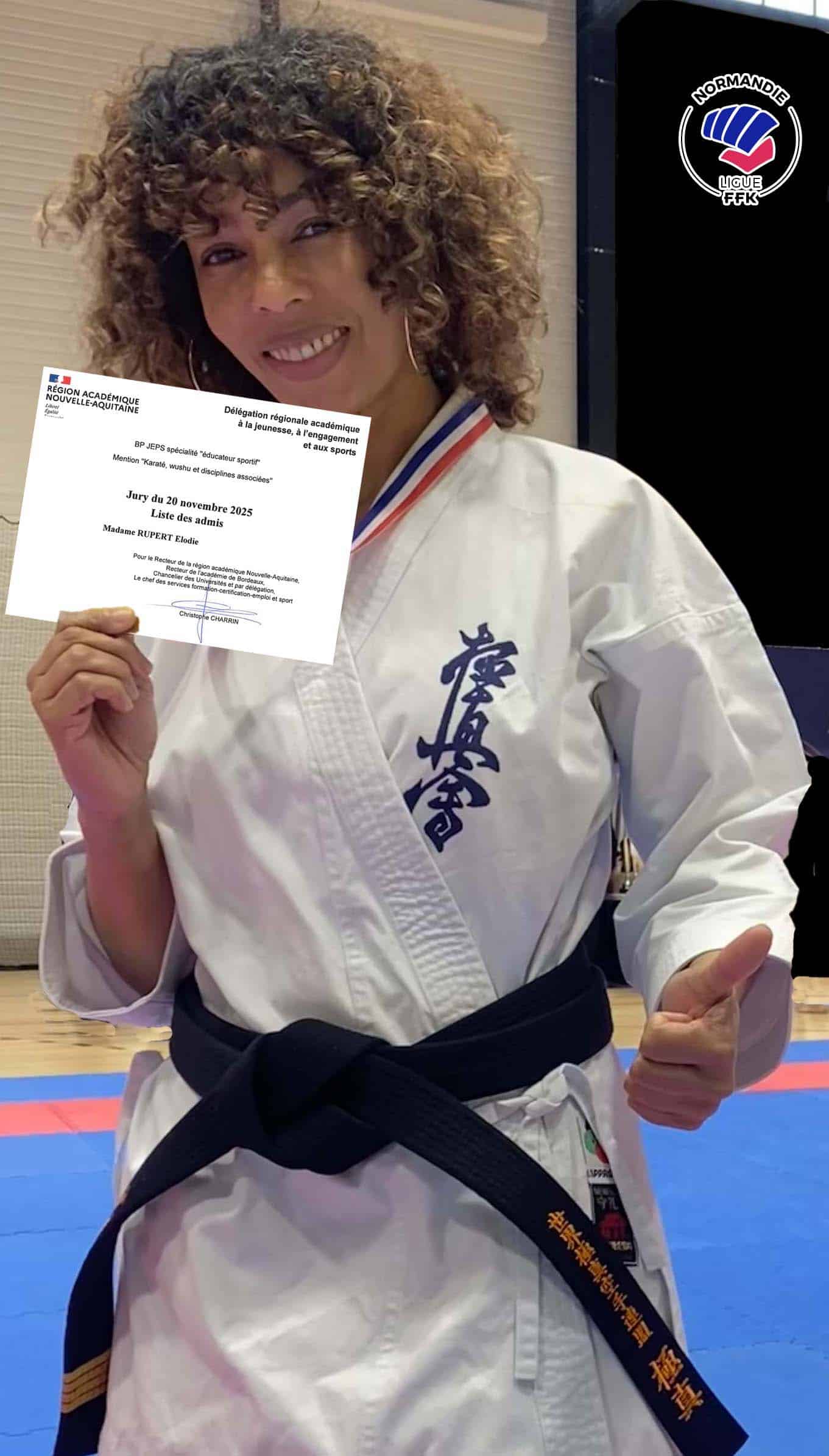 Depuis près de 2 ans, elle a préparé un diplôme d’état de Professeur de Karaté (B.P.J.E.P.S.) d’une part pour optimiser ses compétences envers ses élèves de Zumdo Body Karaté et de Kyokushinkai, et d’autre part pour grossir ainsi son CV martial déjà bien fourni.