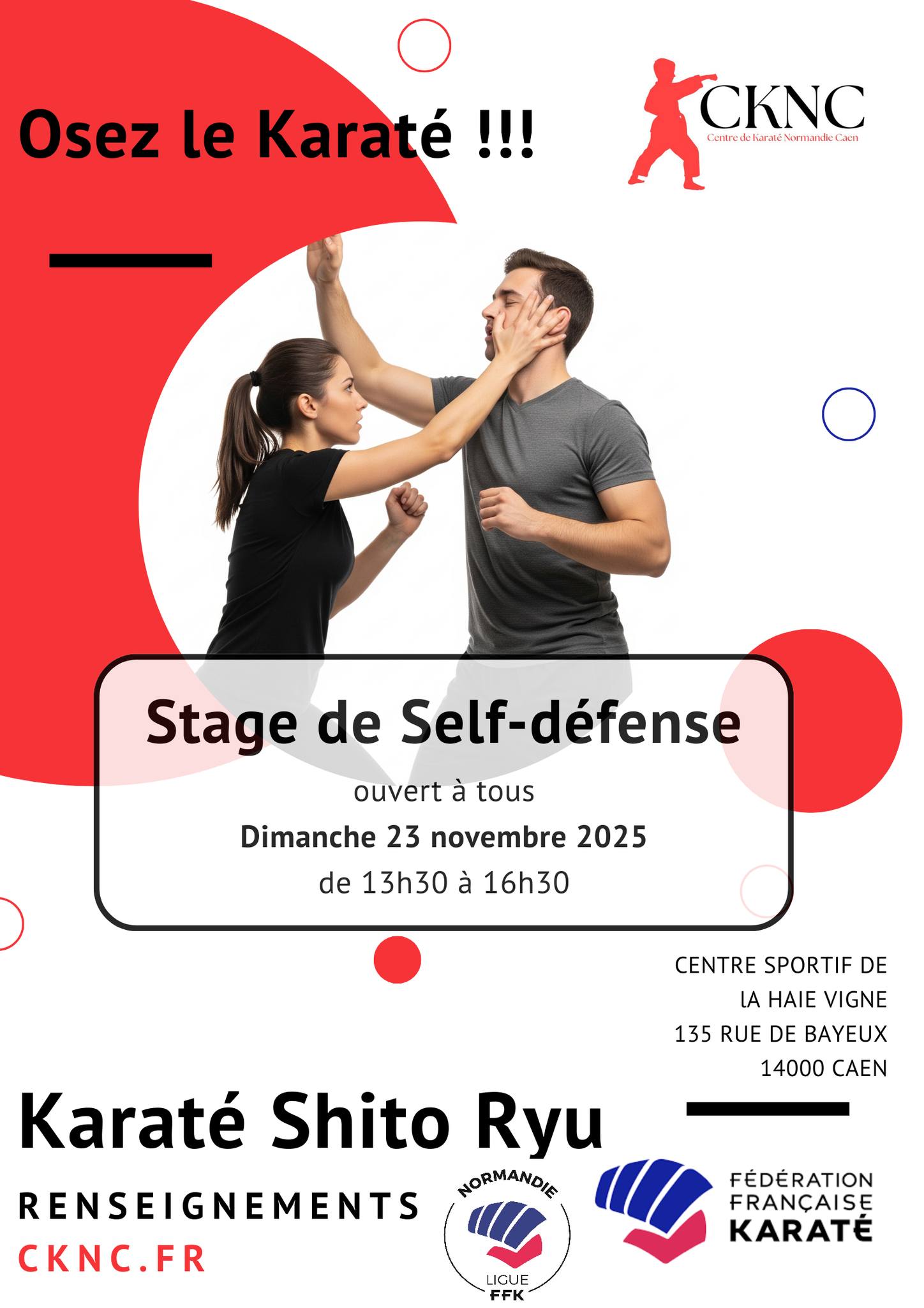 Je vous informe que cette année, comme en 2017,2018 et 2019 notre club, le CKNC ( Centre de Karaté Normandie Caen) organise une prote ouverte qui aura lieu le 11 mars 2023 à la Haie Vignée de16h30à 18h30.