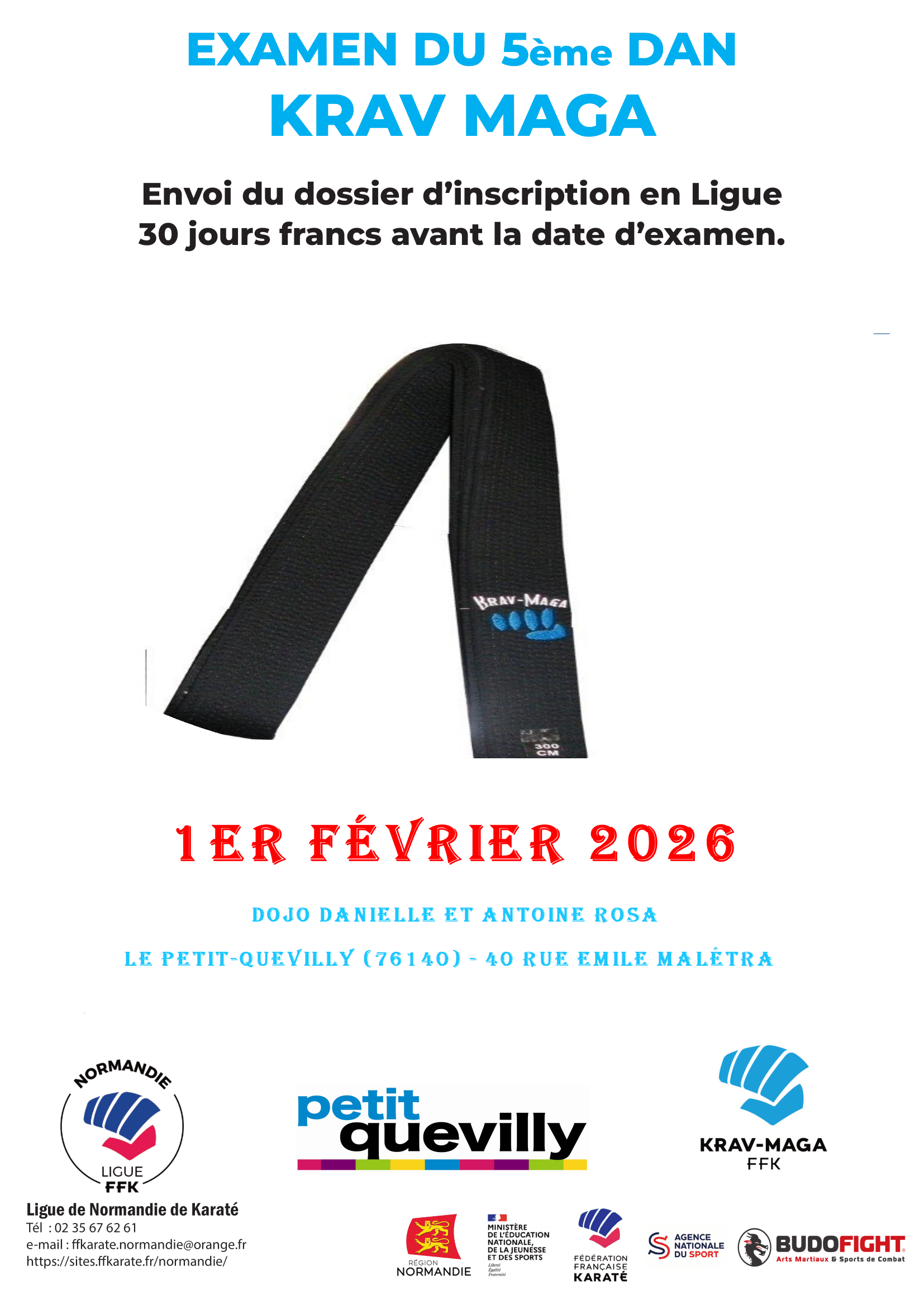 EXAMEN 5EME DAN KRAV MAGA Date Dim. 1 Février 2026 Lieu Dojo CSMPQ40 RUE EMILE MALETRA 76140 LE PETIT-QUEVILLY
