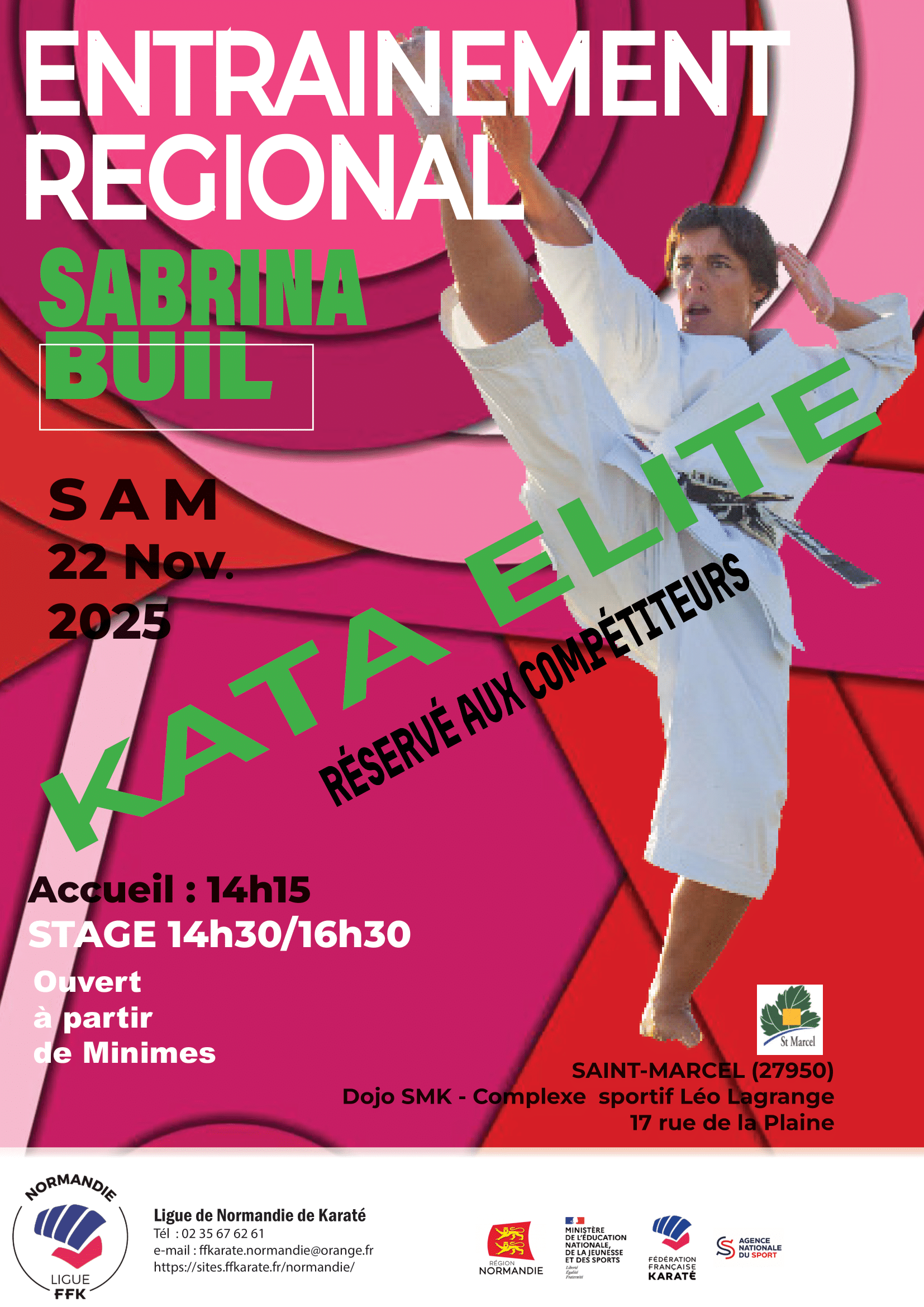 STAGE REGIONAL KARATE – KATA Date Sam. 22 Novembre 2025 Lieu Complexe sportif Léo Lagrange18 RUE DE LA PLAINE 27950 SAINT-MARCEL