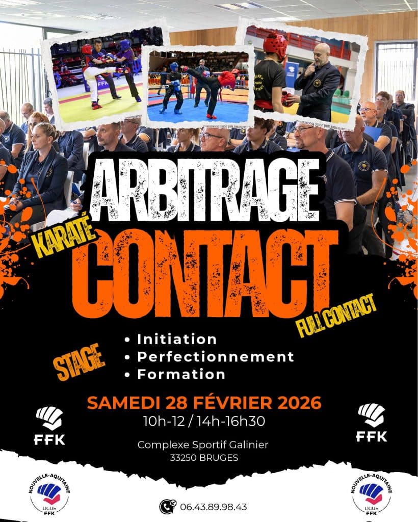 STAGE ARBITRAGE KARATE CONTACT Date Sam. 28 Février 2026 de 10h à 16h Lieu BRUGES (33)62 Avenue de Verdun