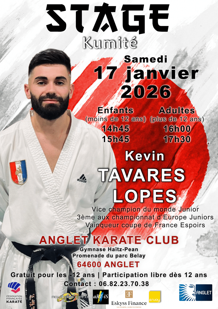 Stage à vocation sportive pour toutes et tous ( compétiteurs et non compétiteurs) avec Kevin Tavares Lopes vice-champion du monde junior. Protections poings et pieds obligatoires.