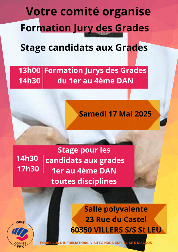 Vous souhaitez faire partie du jury des grades, alors rendez-vous samedi 17 mai à 13h00 jusque 14h00 pour une formation.