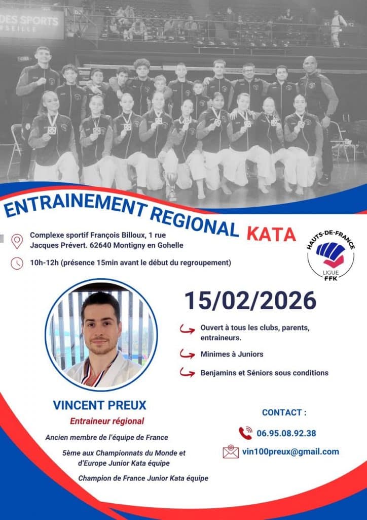Entraînement Régional Kata –Vincent PREUX Date Dim. 15 Février 2026 de 10h à 12h Lieu Complexe sportif François Billoux 1 rue Jacques Prévert 62640 Montigny en Gohelle