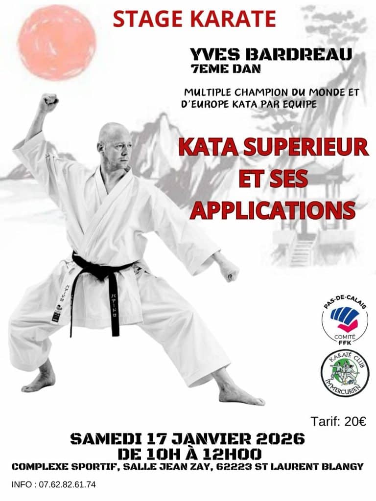 Stage karaté avec Yves BARDREAU 7 éme DAN Date Sam. 17 Janvier 2026 de 10h à 12h Lieu salle Jean Zay 62223 St Laurent Blangy