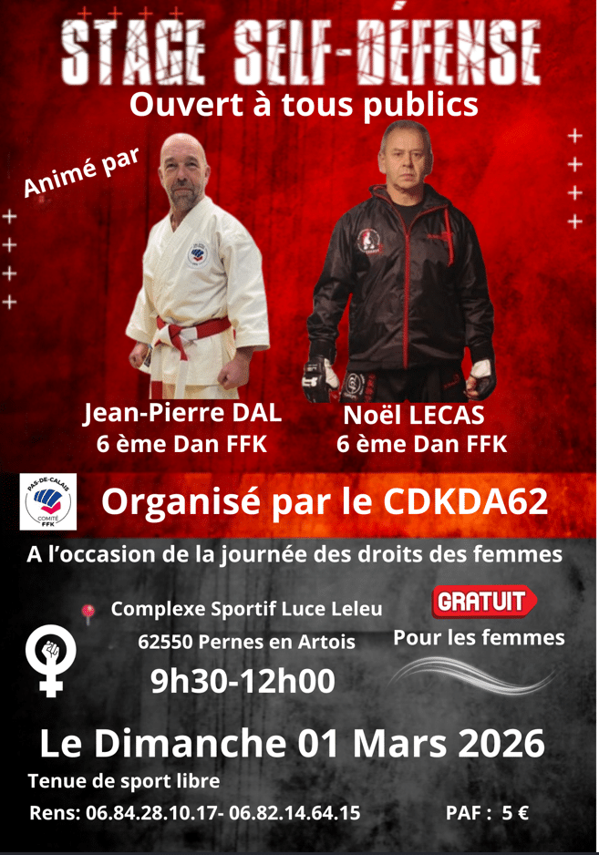 Stage Self – Défense Jean Pierre DAL et Noël LECAS Date Dim. 1 Mars 2026 de 09h30 à 12h Lieu Complexe sportif Luce Leleu 62550 Pernes en Artois