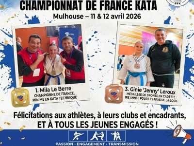 Les 11 et 12 avril 2026 à Mulhouse, les Championnats de France de karaté – spécialité kata – ont mis en lumière de très belles performances, reflet du travail engagé au quotidien par les athlètes, leurs clubs et leurs entraîneurs. Nous adressons toutes nos félicitations à : * Mila Le Berre, Championne de France minime [...]