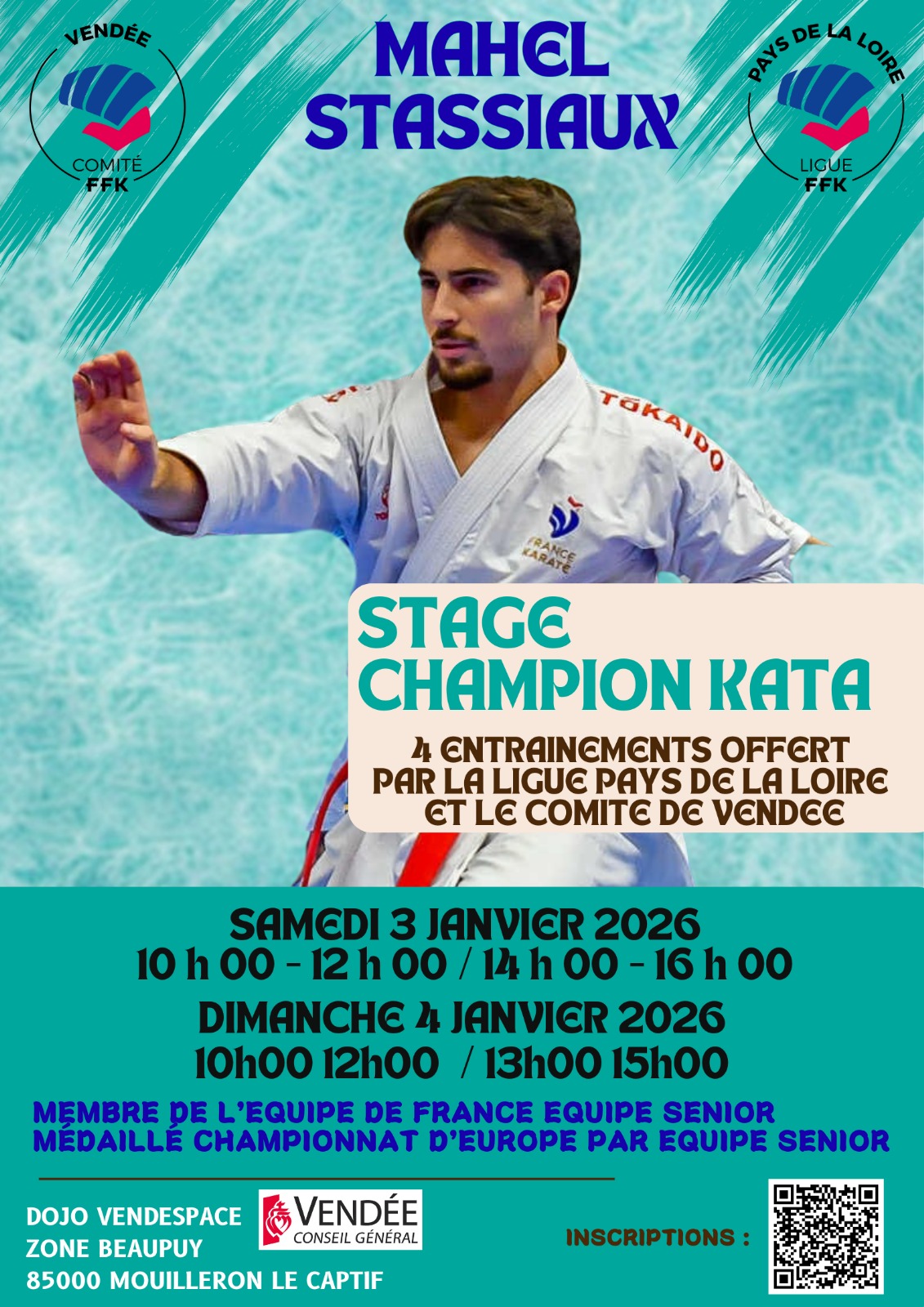 STAGE CHAMPION KATA MAHEL STASSIAUX Date Du Sam. 3 au Dim. 4 Janvier 2026 Lieu VENDESPACEZONE BEAUPUY 85000 MOUILLERON-LE-CAPTIF