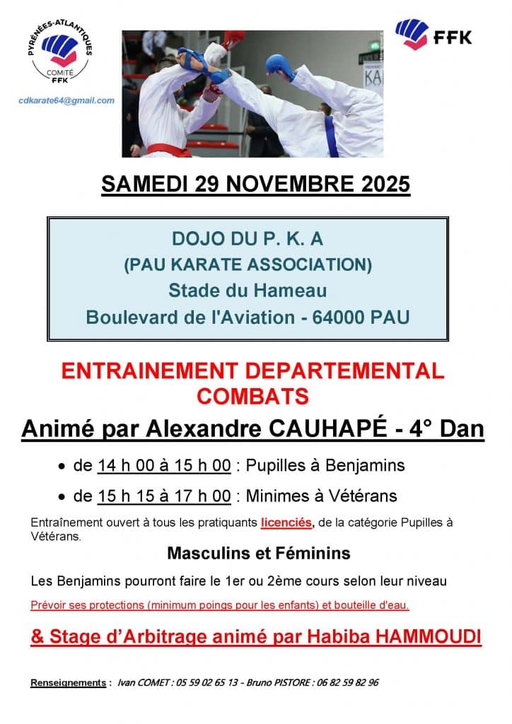 SAMEDI 29/11/2025 de 14 h à 17 h – ENTRAINEMENT DEPARTEMENTAL COMBATS et STAGE D’ARBITRAGE – DOJO du P.K.A. – PAU 17 novembre 2025 FFK