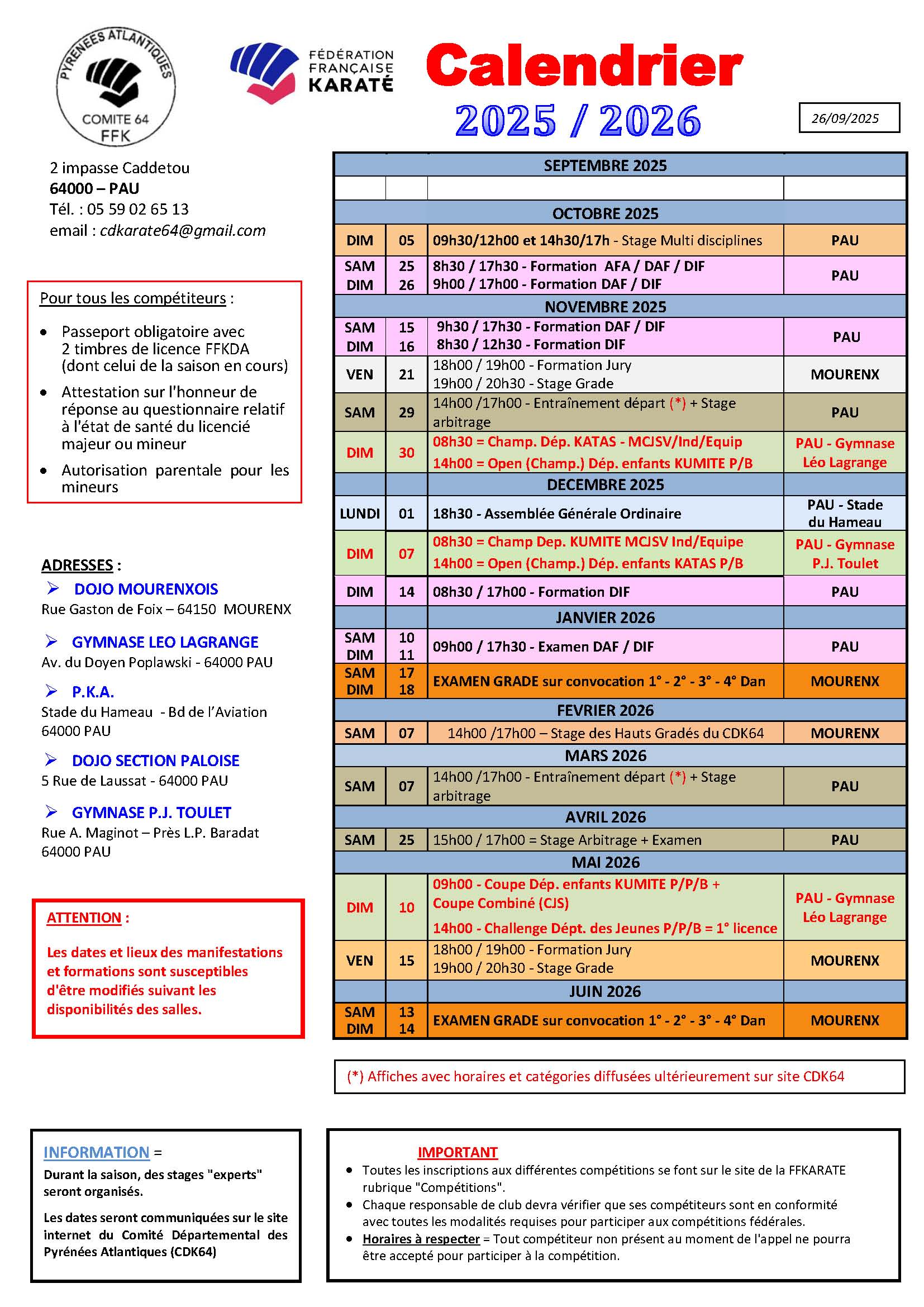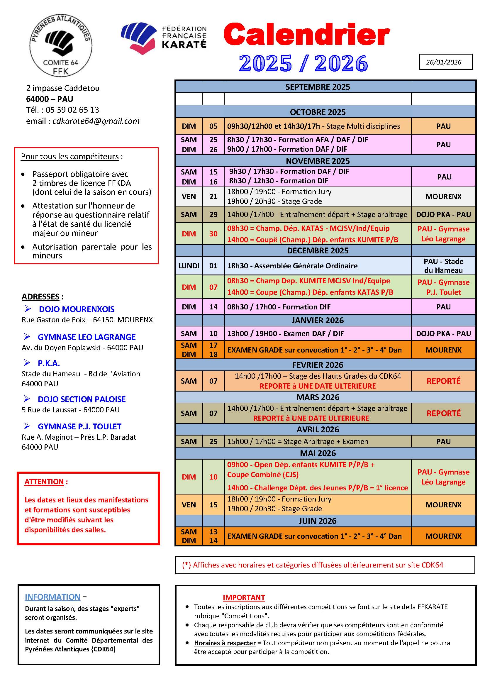 Une fiche annexe au calendrier fixe les modalités horaires des convocations et pesées pour toutes les compétitions de la saison.