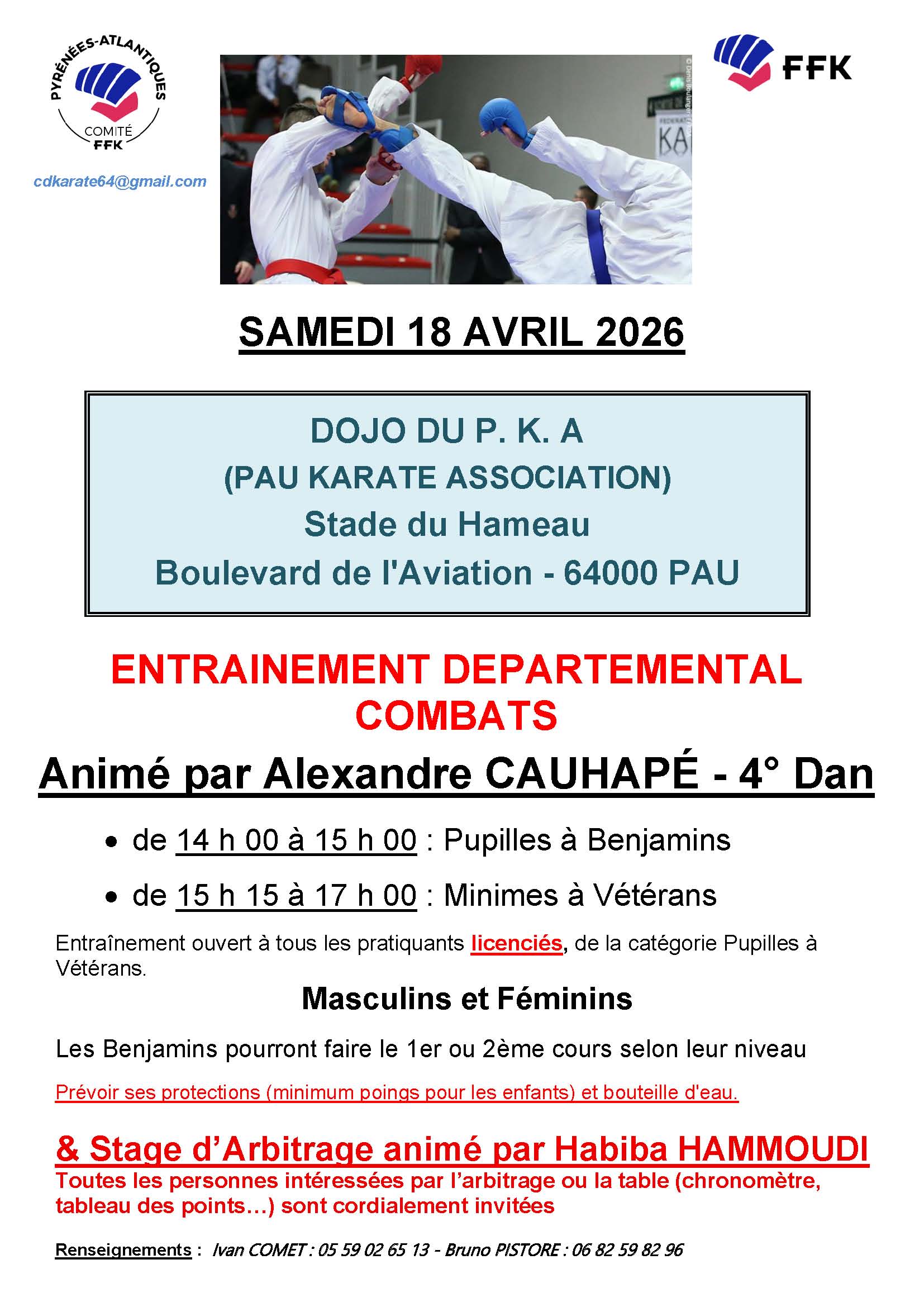 Entraînement Départemental + Stage Arbitrage – Samedi 18 Avril 2026 – PAU (DOJO du P.K.A. – Bd de l’Aviation) Date Sam. 18 Avril 2026 de 14h à 17h Lieu Lieu à Définir à PAU