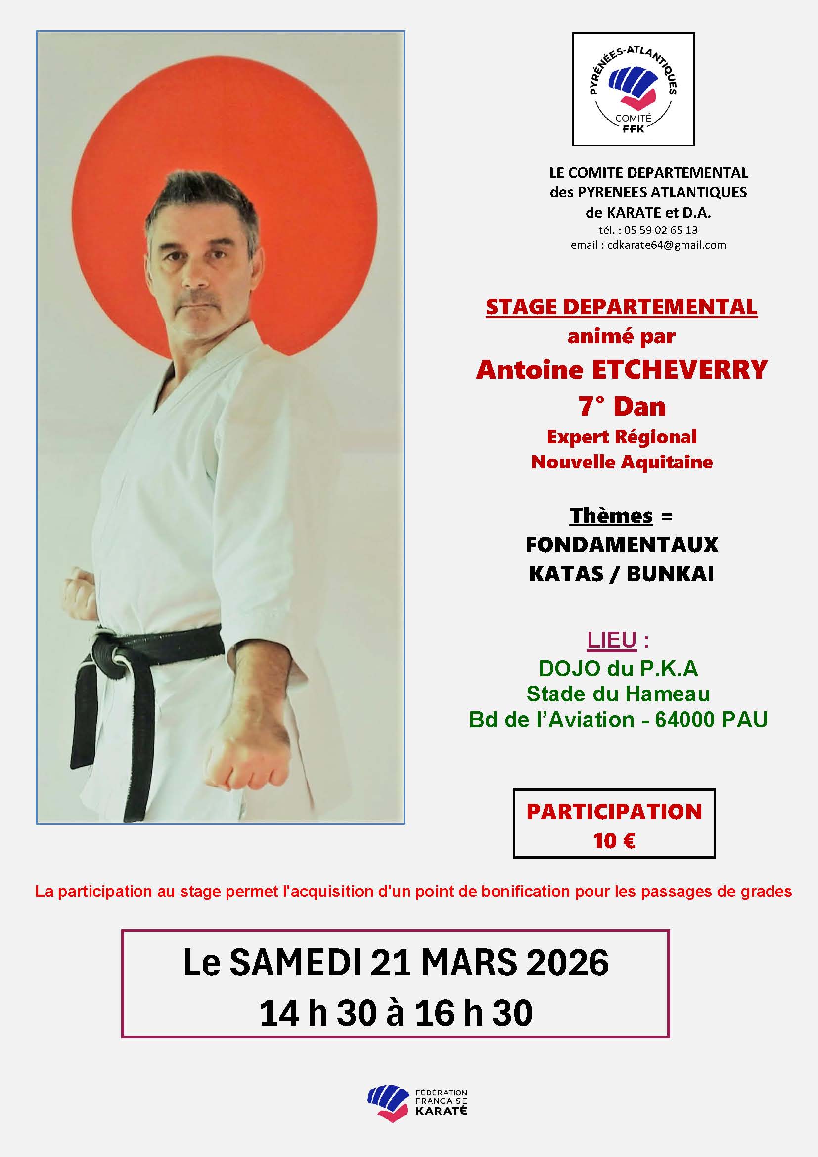 - Samedi 21 Mars 2026 – de 14 h 30 à 16 h 30 – Stage Départemental animé par A. ETCHEVERRY – 7° Dan – Expert Régional Nouvelle Aquitaine – DOJO du P.K.A. – Bd de l’Aviation – PAU