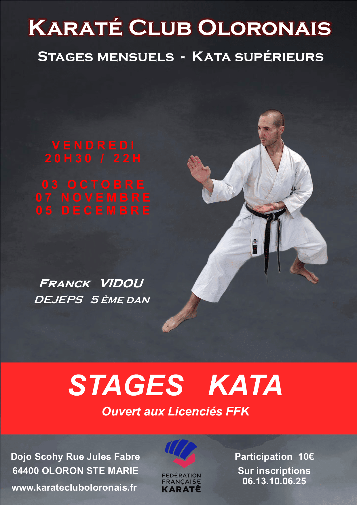 - K.C. OLORON : Stages mensuels KATA animés par Franck VIDOU (5° Dan)- Les vendredis 03/10 – 07/11 – 05/12/2025 – Dojo Scohy – OLORON STE MARIE 64400