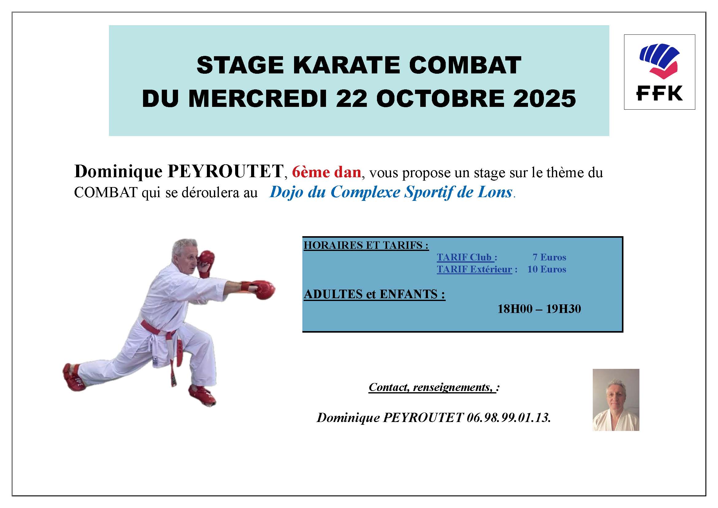 - K.C. LONS : Mercredi 22 Octobre 2025 – Stage Karaté Combat animé par Dominique PEYROUTET – 6° Dan – DOJO du Complexe Sportif de LONS 64140