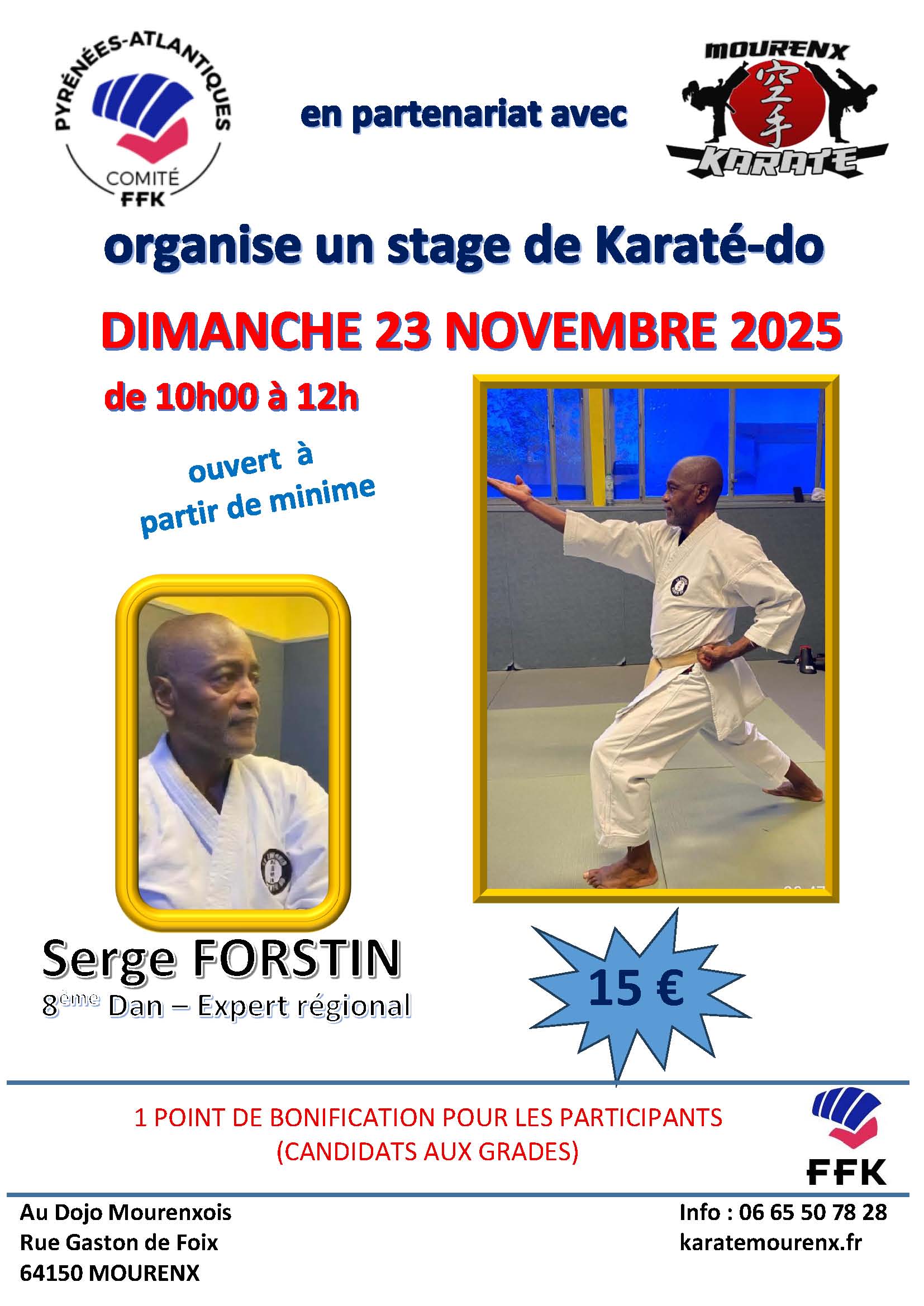- MOURENX KARATE : Dimanche 23 Novembre 2025 – Stage Karaté Do animé par Serge FORSTIN (8° Dan – Expert Régional) – DOJO Mourenxois – 64150 MOURENX
