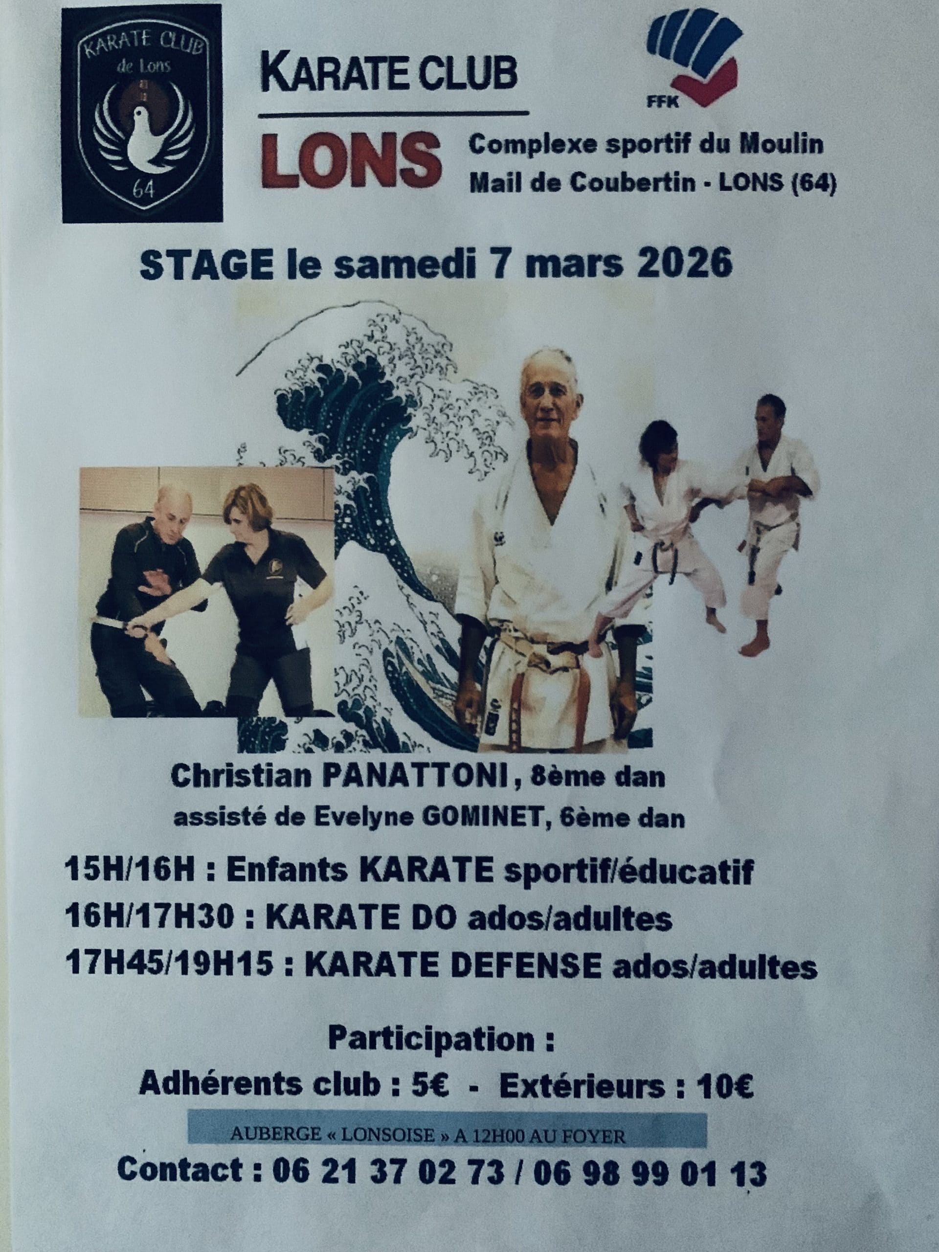 - K.C. LONS : Samedi 07 Mars 2026 – Stages animés par Christian PANATTONI (8° Dan) assisté de Evelyne GOMINET (6° Dan) – DOJO Complexe Sportif du Moulin – LONS 64140