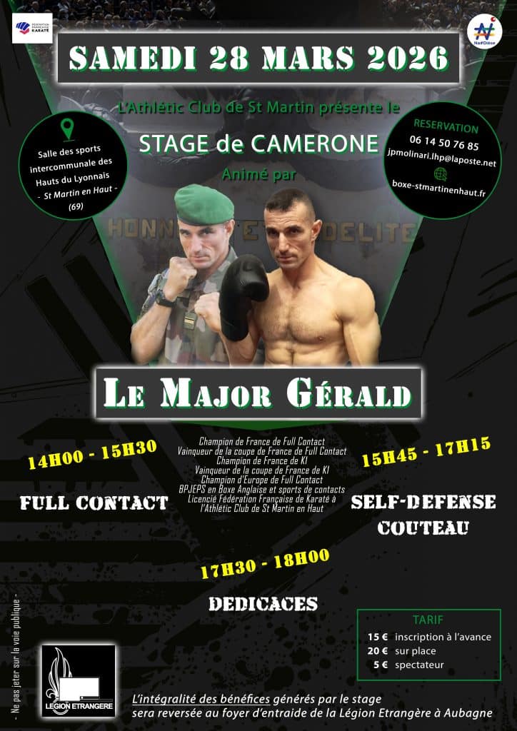 Le plus célèbre des Légionnaires revient dans son club à St Martin en Haut pour un stage de Karaté-Full Contact et défense couteau dont les bénéfices seront intégralement reversés au foyer d’entraide de la Légion Etrangère à Aubagne.