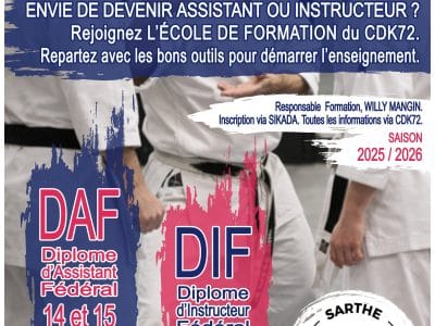 Le Samedi 14 et Dimanche 15 Mars 2026 aura lieu la formation DAF 2026. Cette formation aura lieu au Dojo ALICE MILLAT, 7 Boulevard Louis le Prince Ringuet au Mans. Cette formation sera animée par Willy MANGIN, Responsable de la Formation et de la Formation continue. Concernant les inscriptions, vous trouverez les informations sur la [...]