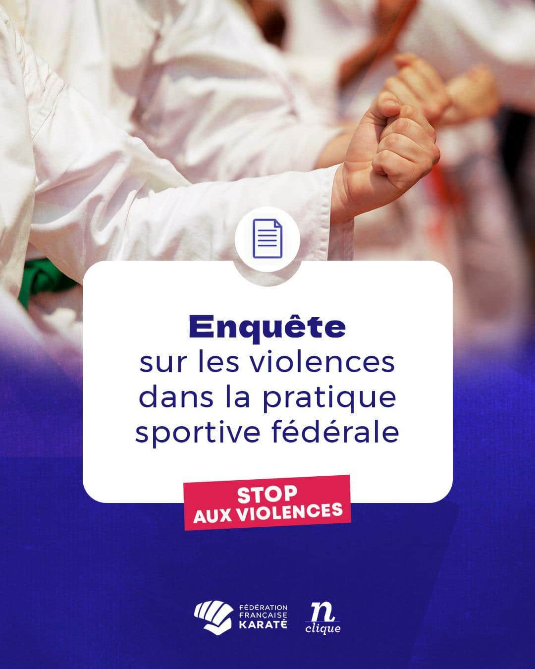 #Engagement La Fédération Française de Karaté et Disciplines Associées lance, en collaboration avec 𝗻-𝗰𝗹𝗶𝗾𝘂𝗲, une enquête nationale qui porte sur 𝘁𝗼𝘂𝘁𝗲𝘀 𝗹𝗲𝘀 𝗳𝗼𝗿𝗺𝗲𝘀 𝗱𝗲 𝘃𝗶𝗼𝗹𝗲𝗻𝗰𝗲𝘀 𝗮𝘂 𝘀𝗲𝗶𝗻 𝗱𝗲 𝗻𝗼𝘁𝗿𝗲 𝗱𝗶𝘀𝗰𝗶𝗽𝗹𝗶𝗻𝗲.