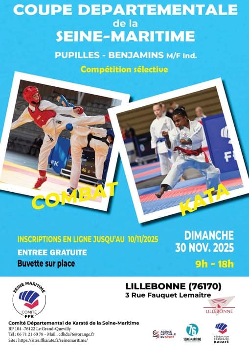 Coupe départementale de karaté Combat Pupilles et Benjamins F/H Date Dim. 30 Novembre 2025 Lieu Dojo Michel Dossier3 RUE FAUQUET LEMAITRE 76170 LILLEBONNE .