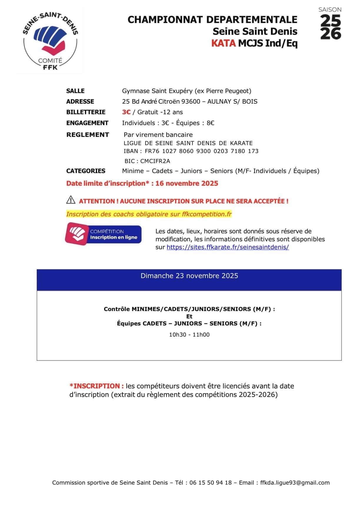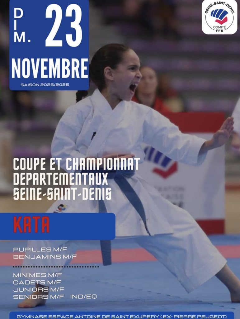 CHAMPIONNAT DÉPARTEMENTAL KATA MINIMES/CADETS/JUNIORS/SÉNIORS & ÉQUIPES CADETS-JUNIORS ET SÉNIORS Date Dim. 23 Novembre 2025 Lieu Gymnase Pierre Peugeot Boulevard André Citroen 93600 AULNAY S/ BOIS