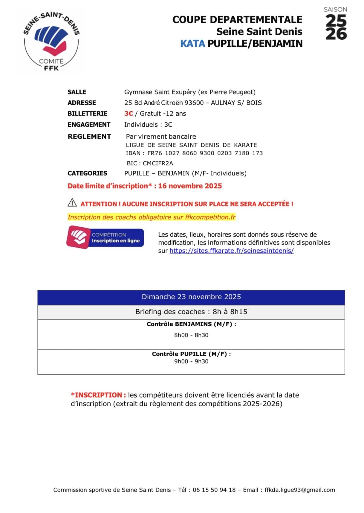 COUPE DÉPARTEMENTAL KATA PUPILLES/BENJAMINS Date Dim. 23 Novembre 2025 Lieu Gymnase Pierre Peugeot Boulevard André Citroen 93600 AULNAY S/ BOIS