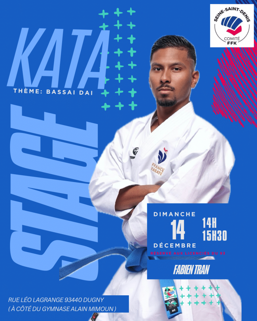 Stage Départemental kata – FABIEN TRAN Date Dim. 14 Décembre 2025 de 14h30 à 15h30 Lieu Gymnase Alain Mimoun Rue Léo Lagrange 93440 DUGNY