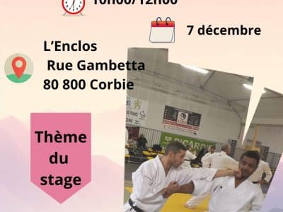 Dimanche 7 décembre le club de Corbie accueille le stage technique dirigé par David CASETTA 6ème DAN Le stage est gratuit et ouvert à partir de la ceinture marron Inscription obligatoire sur SIKADA jusqu'au 5 décembre