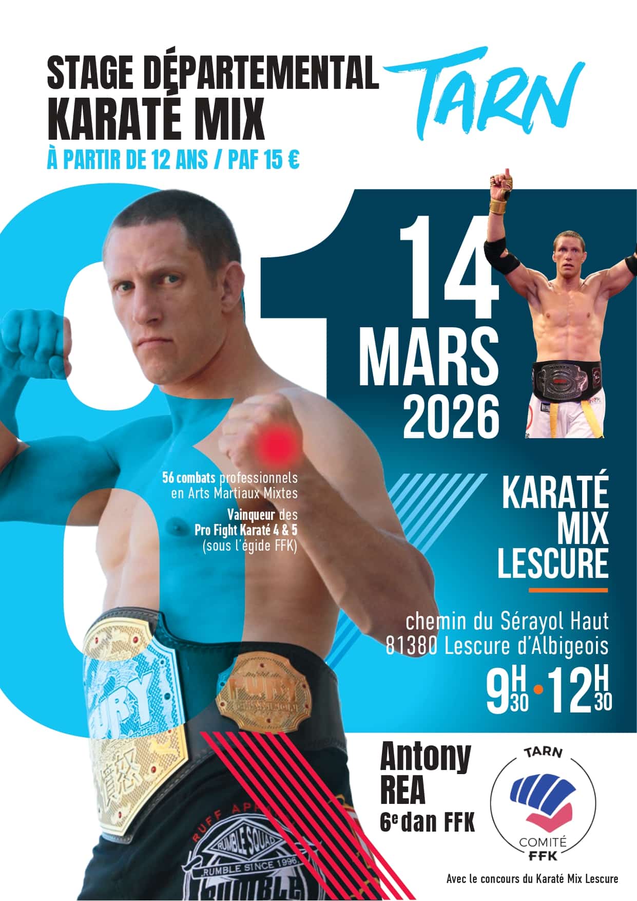 Stage avec Antony REA – 6ème Dan Date Sam. 14 Mars 2026 de 09h30 à 12h30 Lieu Karaté Mix de Lescure - chemin du Sérayol Haut 81380 Lescure d’Albigeois