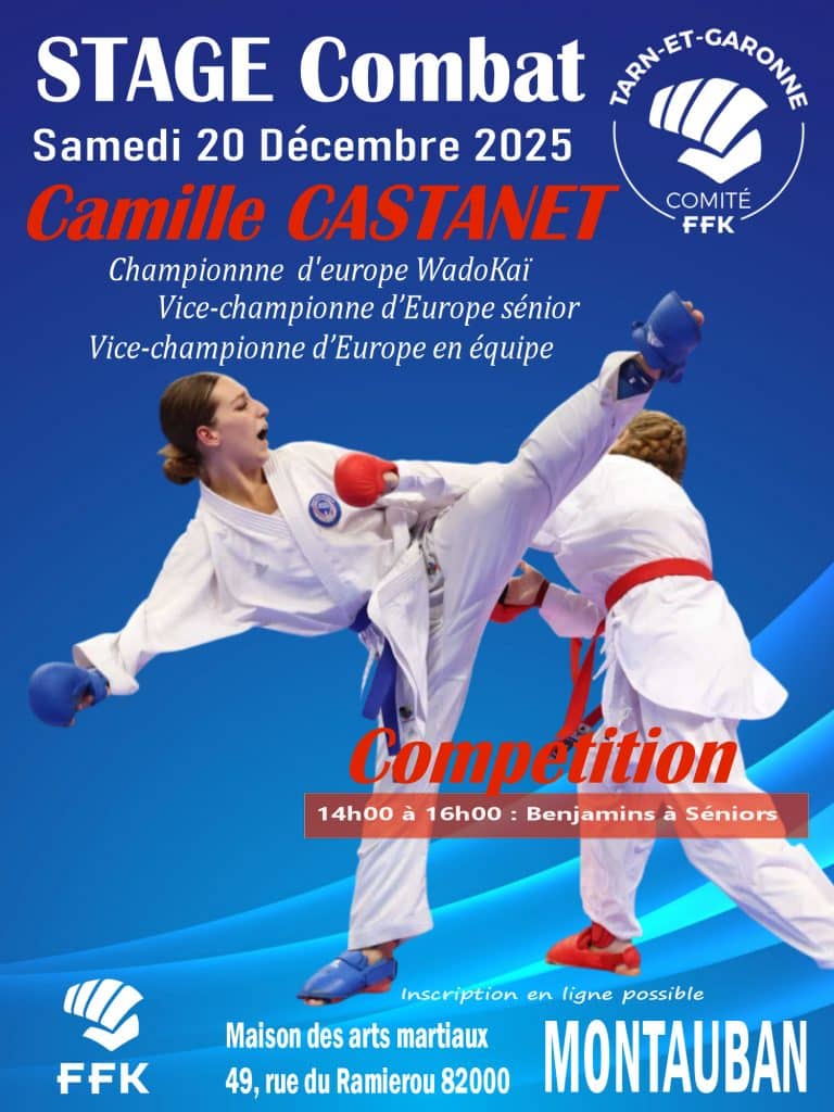 Le comité départemental organise un stage combat compétition, qui sera animé par Camille CASTANET, Championne d'Europe Wado-Kaï, Vice championne d'Europe sénior et équipe. Ce stage gratuit se déroulera à l'AMM le samedi 20 décembre 2025 de 14h à 16h pour les catégories benjamins a séniors. Privilégiez l'inscription en ligne.