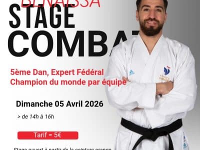 Le CDK82 vous propose stage combat a vocation sportive pour tous a partir de ceinture orange. Ce stage sera animé par Nadir BENAISSA , 5ème Dan, expert Fédéral, Champion du monde par équipe. Date: 05/04/2026 Lieu: AMM montauban Tarif: 5€